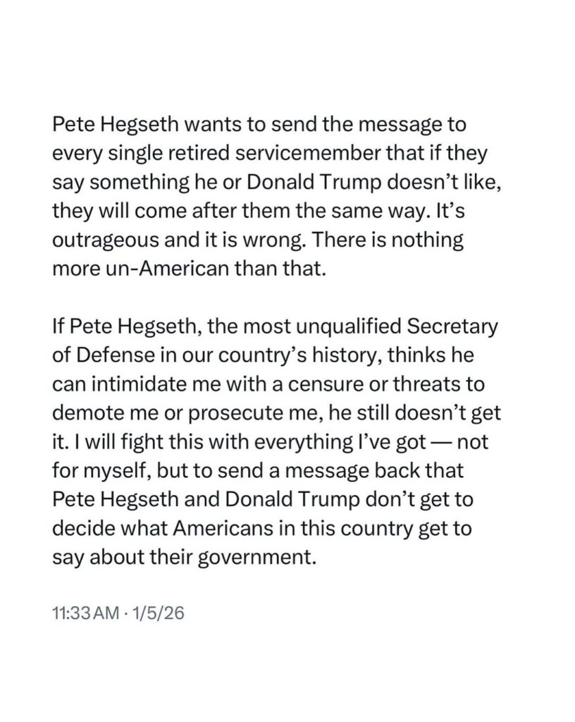 “I will fight this with everything I’ve got — not for myself, but to send a message back that Pete Hegseth and Donald Trump don’t get to decide what Americans in this country get to say about their government,” Kelly stated.